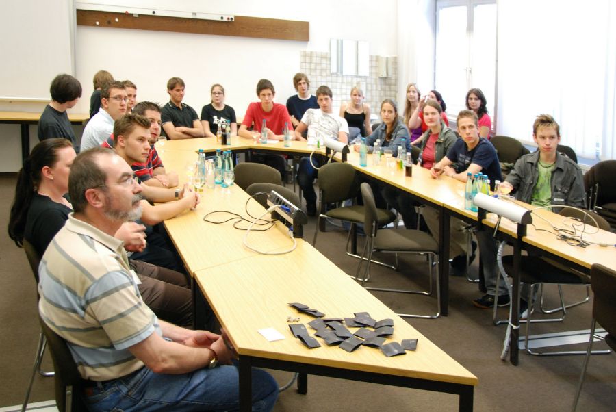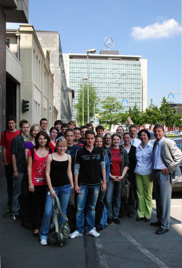 Voller Spannung machte sich am 10. Juni eine kleine Gruppe des LG 57 auf den Weg nach Untertürkheim in das Stammwerk des Konzerns. Hier hat die Daimler AG Entwicklung, Produktion und Versand von Motoren, Getrieben und Achsen für den Geschäftsbereich Mercedes-Benz Cars konzentriert. Jährlich werden in diesem Werk Achsen, Getriebe und Motoren für mehr als eine Million Fahrzeuge produziert. Bei der Besucheranmeldung auf der Bad Cannstatter Seite des Werks - ebenso neu wie das benachbarte Daimler-Benz-Museum - wurden wir von Manuela Josteit (LG 34) empfangen und erhielten Besucherausweise. Wir gingen die Daimlerstraße entlang, vorbei an dem ältesten Gebäude des Werks, in dem auch Gottlieb Daimler sein Büro hatte. Im Konferenzraum begrüßte uns Arno Kiechle (LG 20), der Leiter der Abteilung Verfahrensentwicklung Fluide und Qualitätsprüftechnik, gab uns einen kurzen Einblick in seinen Lebenslauf, wie er zu Daimler kam, welche Stationen er durchlief und informierte uns über Aufgaben und Struktur des Werks und seiner Abteilung, die im Bereich Produktions- und Werkstofftechnik angesiedelt ist. Die Abteilung beschäftigt sich u.a. mit Industrieschmierstoffen und temporären Korrosionsschutzstoffen, Oberflächenvorbehandlung, Bauteilesauberkeit, Kraftstoffen und Bremsflüssigkeiten, chemischen und physikalischen Prüfverfahren und Oberflächenmesstechnik. |