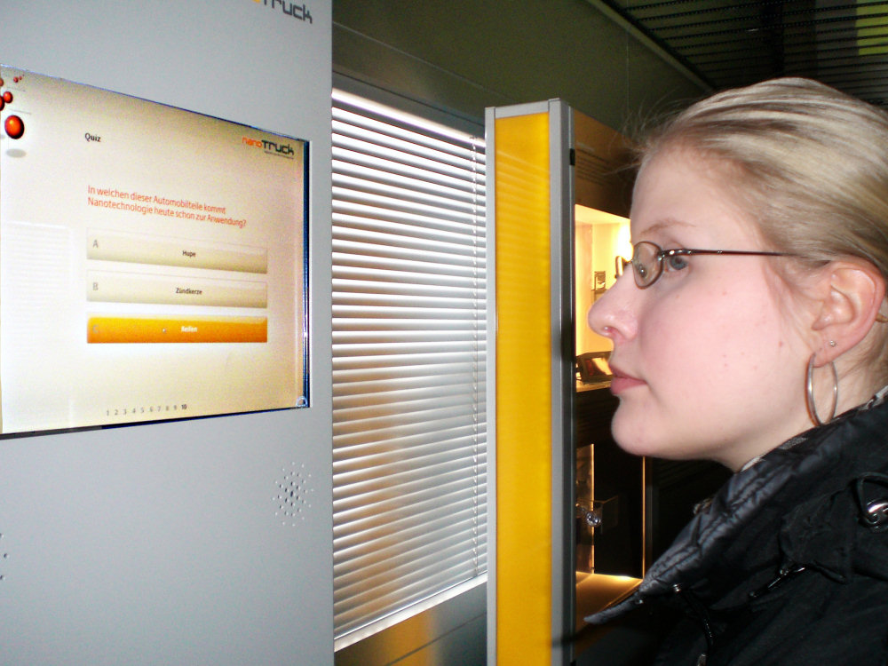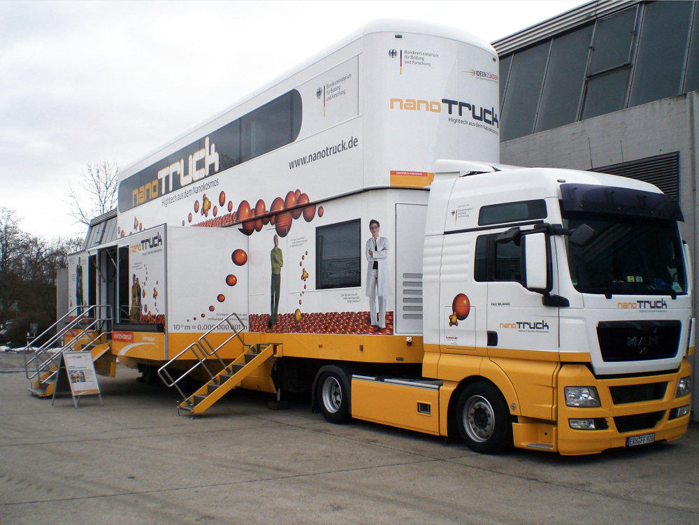 Das mobile Ausstellungs- und Kommunikationszentrum nanoTruck des BMBF präsentierte auf zwei Ebenen Nanotechnologie live. Über 60 vorwiegend interaktive Exponate präsentierten anschaulich und allgemein verständlich das komplexe Spektrum nanotechnologischer Forschung und Anwendung.