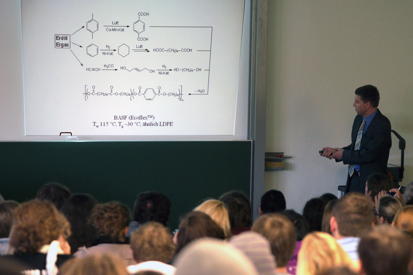 "Eine verrückte chemische Reaktion", so beschrieb Professor Mecking in seinem Gastvortrag im Rahmen der 15. Stuttgarter Chemietage die in seiner Forschungsgruppe entwickelte Methode, allein aus Fettsäuren Polyester herzustellen, die ähnlich kristallisierbar sind wie ihr petrochemisch hergestellter Konkurrent und ein vergleichbares Schmelzverhalten für thermoplastische Verarbeitungszwecke aufweisen.