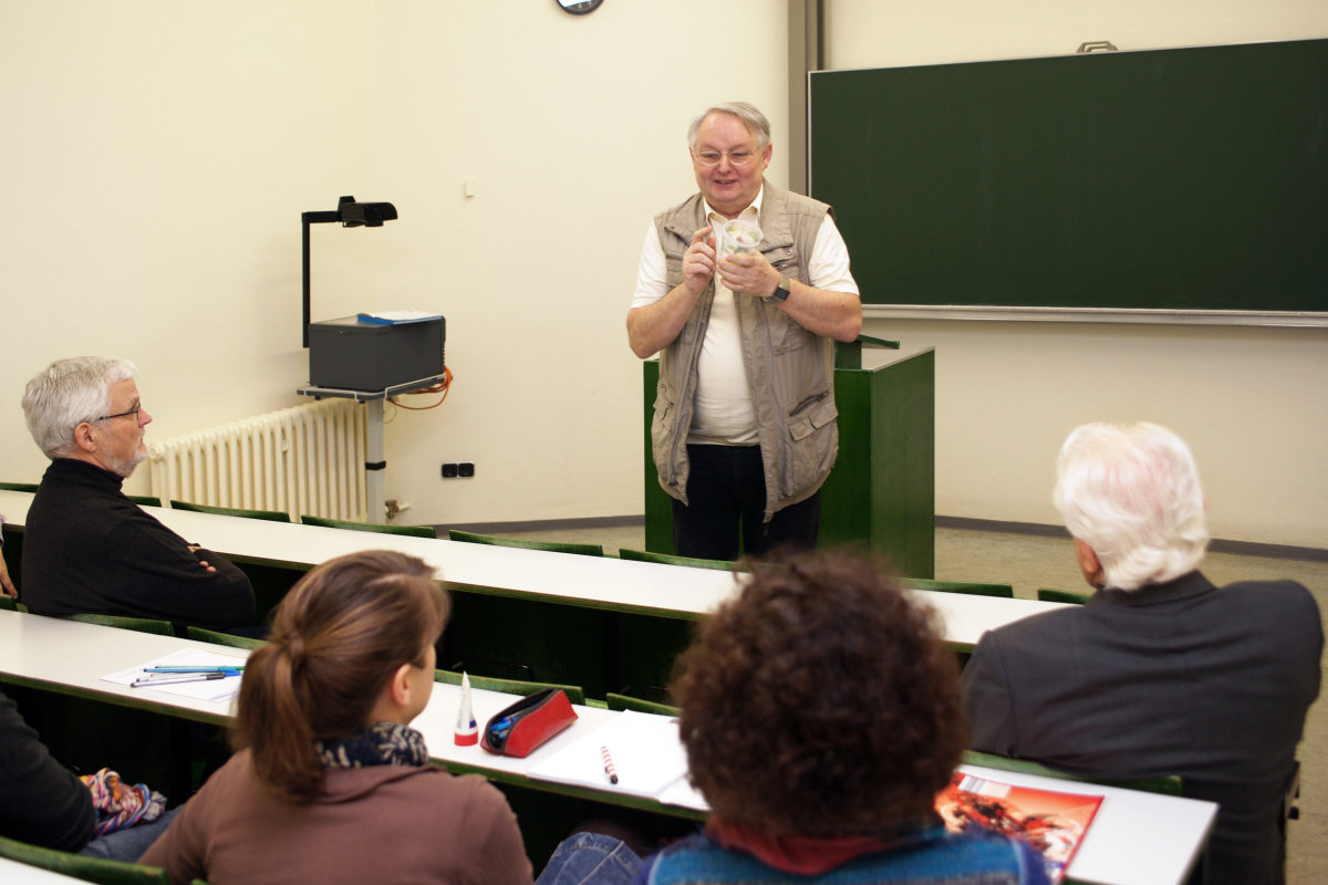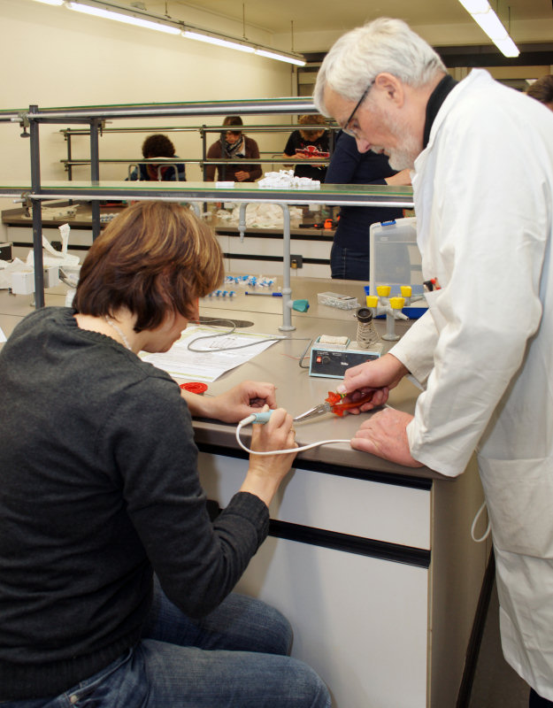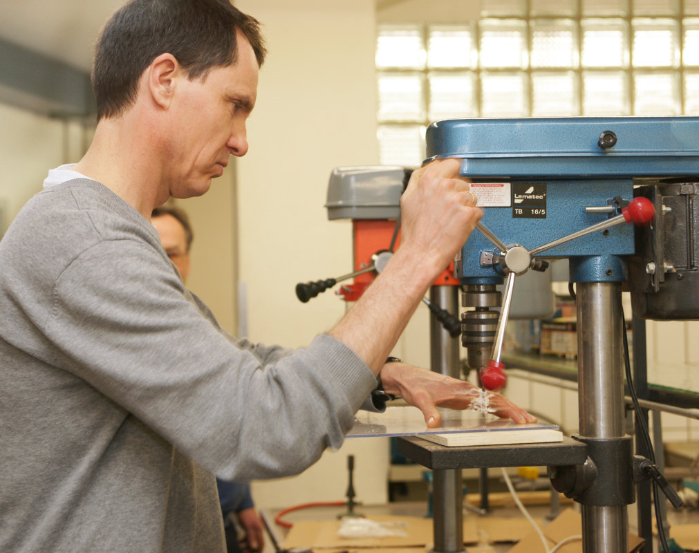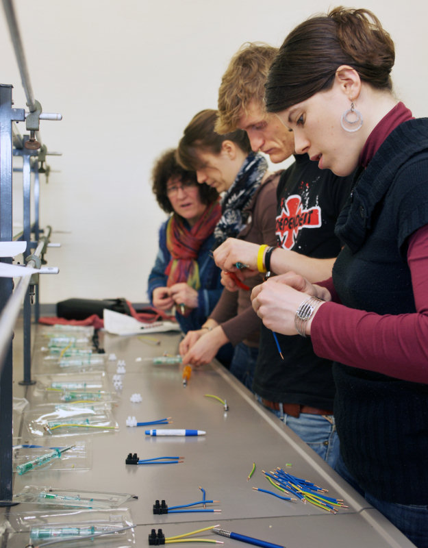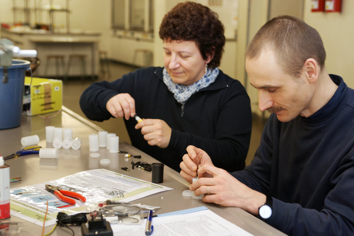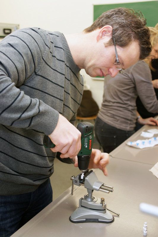"Do It Yourself" - Lehrerfortbildung mit Dr. Franz Kappenberg 23 Kolleginnen und Kollegen trafen sich am 3. März 2012 im Institut Dr. Flad, um unter Anleitung des Experten für "Low-Cost-Geräte", Dr. Franz Kappenberg, einen ganzen Tag lang Geräte für die Schule, insbesondere für Schülerversuche, selbst zu bauen. 33 verschiedene Versuchsaufbauten standen zur Auswahl, für die das Material schon im Vorfeld bestellt wurde, sodass die Teilnehmer gleich mit der Umsetzung der Bauanleitungen beginnen konnten. Ohne Unterlass wurde gefeilt, geschraubt, geklebt, gebohrt und gelötet und um 17 Uhr waren dann rund 500 Aufbauten (!) fertiggestellt. Das Institut Dr. Flad stellte neben den Räumlichkeiten, der Verpflegung, den Maschinen und den fachkundigen Helfern auch Material im Wert von bis zu 100 Euro pro Schule zur Verfügung. Am Ende des Tages konnten alle 23 Lehrerinnen und Lehrer mit einer Tasche voll neuer, selbstgebauter Geräte sowie mit vielen neuen handwerklichen Erfahrungen den Weg nach Hause antreten. Sarah Lumpp |