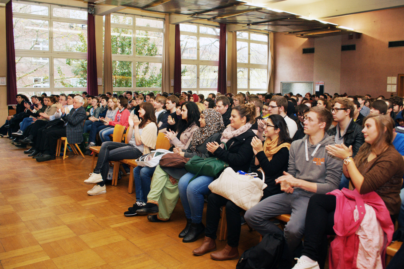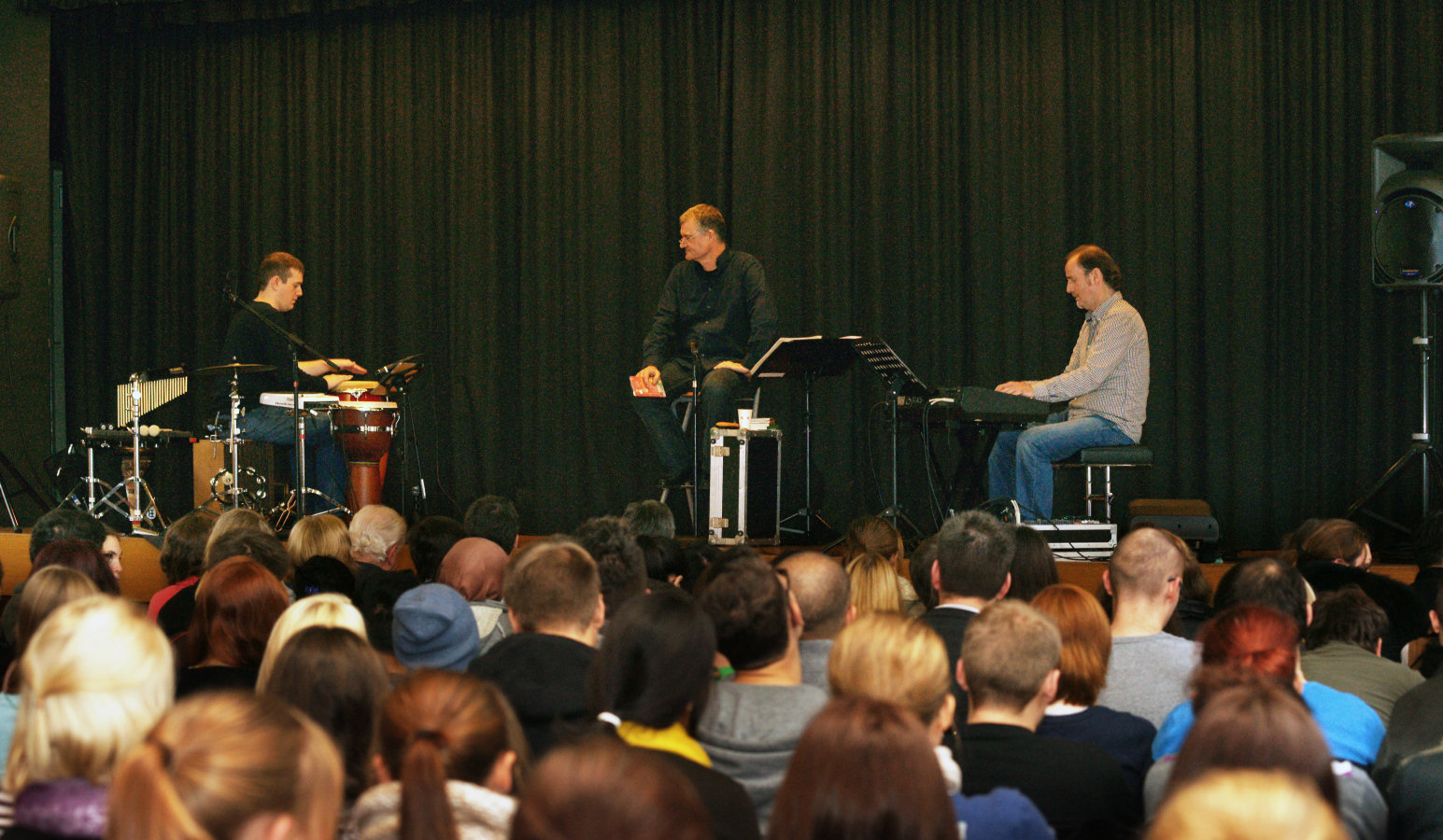 Von Glücksgefühlen, Pechsträhnen und sonstigen Emotionen Eben diesen Emotionen verlieh Christoph Zehendner mit seinen Kurzgeschichten Ausdruck, als er am 8. November 2013 wieder einmal für die Schüler und Mitarbeiter des Institutes Dr. Flad auf der Bühne stand. In seinem gelungenen und abwechslungsreichen Programm, das wie gewohnt musikalisch ergänzt wurde, erzählte er Geschichten, wie sie das Leben schreibt. Mit karibischen Klängen gelang den beiden Musikern Ulrich und Daniel Schwenger ein mitreißender Auftakt - mit viel Rhythmusgefühl und Fingerfertigkeit sorgten der Percussionist und der Hobby-Pianist für Aufmerksamkeit und die ersten Glücksgefühle. Und genau unter diesem Titel stand auch die erste Kurzgeschichte, die von ihrem Autor Christoph Zehendner lebhaft und anschaulich vorgetragen wurde: künstliche Hormone, unter anderem entwickelt zur Beimengung in den Messwein, sollten für mehr Euphorie und Zufriedenheit der Gemeinde führen. Doch ob die durch künstliche Hormone erzeugten Glücksgefühle wohl der richtige Weg wären, daran hatte der Pfarrer zum Glück erhebliche Zweifel... Einen anderen Weg zu Glücksgefühlen suchte der Protagonist der zweiten Erzählung: er vertrat entschlossen die Auffassung, dass man Glücklichsein auch dadurch erreiche, seine Zeit und seine Gaben zu nutzen, und sich nicht ziellos treiben zu lassen. Doch immer wieder scheiterte er an der Überwindung seines inneren Schweinehundes! Zehendners Erzählungen wechselten sich dabei immer wieder mit musikalischen Einlagen ab - mal leicht und beschwingt, mal meditativ - und gaben so die Möglichkeit, über das Gehörte nachzudenken und sich doch immer wieder in den Geschichten auch selbst zu erkennen. Christoph Zehendner gab auch die ein oder andere Kostprobe aus seinem Buch "Das Geheimnis der Zwölf", in dem er, wie er selbst sagt, "Kürzest-Geschichten" von jeweils zwei so unterschiedlichen Personen erzählt, dass sie sich nur durch einen großen Zufall im Leben begegnen, aber dann ganz besondere, einzigartige Erlebnisse teilen. Als geforderte Zugabe brachte Zehendner seine begeisterten Zuhörer noch mit einer kleinen Adventsgeschichte zum Schmunzeln, und stimmte damit auch gleich ein wenig auf die nahende Adventszeit ein. Zum Abschluss machte er seinem Publikum schließlich Mut zum Träumen, zum Spuren hinterlassen und um mit viel Phantasie die Geschichten des eigenen Lebens zu schreiben. Dies unterstrich er mit einem seiner Lieder und den darin immer wiederkehrenden Aufforderungen: Wagen! Hoffen! Beten! Mutig nach vorne sehen! Anne-Marie Sand |