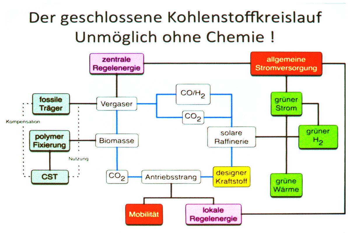 Ein weiteres Problem ist der Preis. Da Strom aus erneuerbaren Quellen regulatorisch kaum gesteuert werden kann, ist er mit 3,5 Cent pro Kilowattstunde billig. Davon merkt der Kunde aber nichts, weil der teure Strom aus fossilen Energieträgern immer dann eingesetzt wird, wenn er gebraucht wird. Ein geschlossener Kohlenstoffkreislauf ist unmöglich ohne Chemie. Ein Beispiel wäre auch die Entwicklung eines neuen Kraftstoffs für Autos