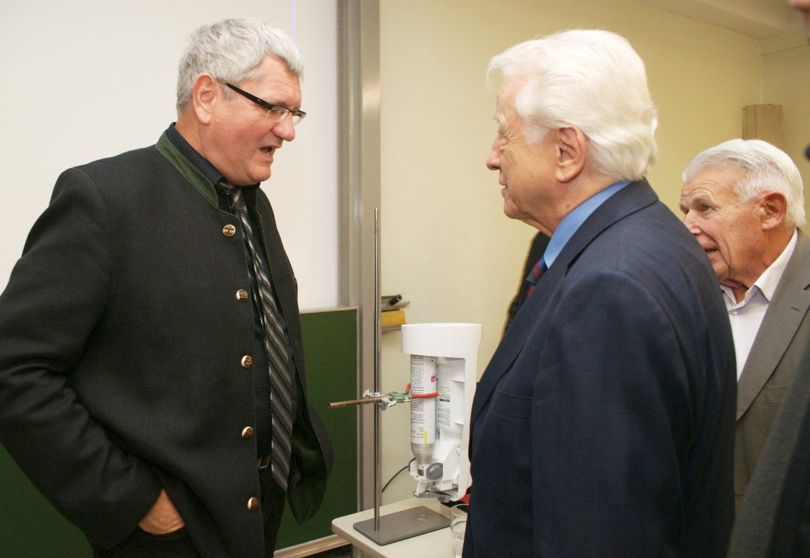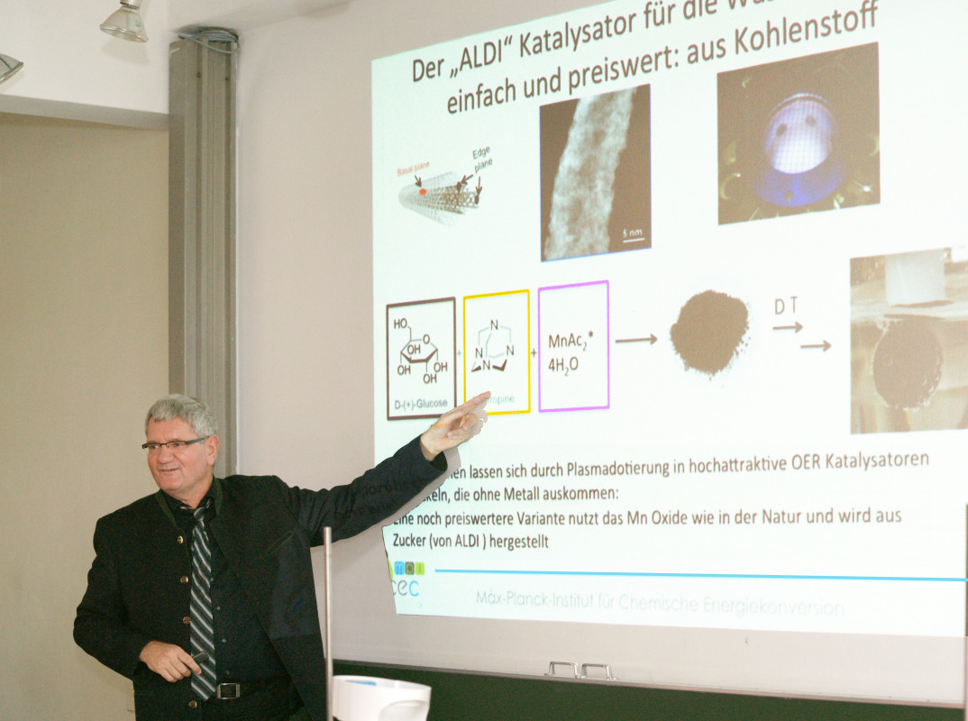 Schulleiter Wolfgang Flad konnte bei der Vorstellung der Vita des Referenten auf eine lange Reihe von Auszeichnungen, Patenten und Positionen im Bereich der Chemie verweisen. Nach dem Abitur von 1973-78 Studium der Chemie in München, 1979 Diplom, 1982 Promotion, 82-85 Post-doc-Studien in Cambridge und Basel, anschließend die Habilitation und von 1989-1994 Professor in Frankfurt/M. Dann seit 1994 Direktor des Max-Planck-Instituts in Berlin und seit 2011 auch Direktor des Max-Planck-Instituts in Mülheim an der Ruhr. Er ist außerdem vierfacher Honorarprofessor an verschiedenen Hochschulen, ist als Gastprofessor tätig und Mitglied in Dutzenden von Kommissionen. Er ist Inhaber von fast 40 Patenten, verfasste zahlreiche Publikationen und ist Träger einer großen Anzahl von Auszeichnungen.