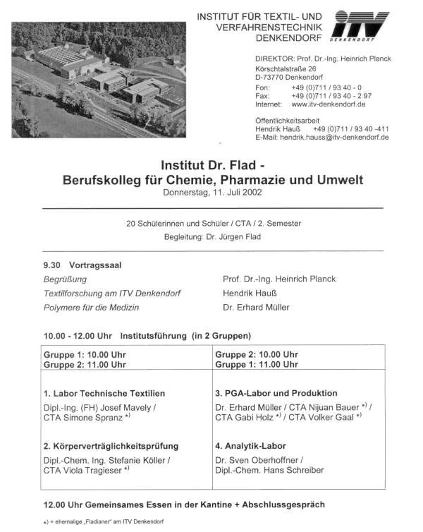 Los ging es am Donnerstag den 11. Juli 2002 um 8.30 Uhr am Busbahnhof in Stuttgart. Herr Dr. Jürgen Flad und 18 Schüler/Innen des Institutes Dr. Flad fuhren auf eine Exkursion, um sich einen Einblick in den Berufsalltag des CTAs zu verschaffen und um zu sehen, welche Möglichkeiten nach der zweijährigen Ausbildung offen stehen.