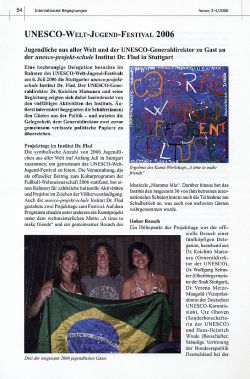 Projekttage im Institut Dr. Flad Die symbolische Anzahl von 2006 Jugendlichen aus aller Welt traf Anfang Juli in Stuttgart zusammen, um gemeinsam das UNESCO-Welt-Jugend-Festival zu feiern. Die Veranstaltung, die als offizieller Beitrag zum Kulturprogramm der Fußball-Weltmeisterschaft 2006 stattfand, bot einen Rahmen für zahlreiche kulturelle Aktivitäten und Projekte im Zeichen der Völkerverständigung. Auch die unesco-projekt-schule Institut Dr. Flad gestaltete zwei Projekttage zum Festival. Auf dem Programm standen unter anderem ein Kunstprojekt unter dem weltmeisterlichen Motto "A time to make friends" und ein gemeinsamer Besuch des Musicals "Mamma Mia". Darüber hinaus bot das Institut den insgesamt 36 von ihm betreuten internationalen Schüler(inne)n auch die Teilnahme am Schulbetrieb an, was auch von mehreren Gästen wahrgenommen wurde.