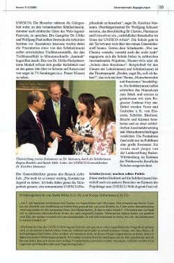 Hoher Besuch Ein Höhepunkt der Projekttage war der offizielle Besuch einer fünfköpfigen Delegation, bestehend aus Dr. Koichiro Matsuura (Generaldirektor der UNESCO), Dr. Wolfgang Schuster (Oberbürgermeister der Stadt Stuttgart), Dr. Verena Metze-Mangold (Vizepräsidentin der Deutschen UNESCO-Kommission), Ute Ohoven (Sonderbotschafterin der UNESCO) und Hans-Heinrich Wrede (Botschafter, Ständige Vertretung der Bundesrepublik Deutschland bei der UNESCO). Die Besucher nahmen die Gelegenheit wahr, zu den versammelten Schüler(inne)n, darunter auch zahlreiche Gäste des Welt-Jugend-Festivals, zu sprechen. Die Gastgeber Dr. Ulrike und Wolfgang Flad stellten ihrerseits die Arbeit des Instituts vor. Besonderes Interesse weckte dabei die Präsentation eines von den Schüler(inne)n selbst entwickelten Treibhausmodells, das den Treibhauseffekt in Minutenschnelle "hautnah" begreifbar macht. Das von Dr. Ulrike Flad präsentierte Modell erfreut sich großer Beliebtheit und ist das ganze Jahr über in Schulen auf Reisen und war sogar in TV-Sendungen (u.a. Planet Wissen) zu sehen. Der Generaldirektor genoss den Besuch sichtlich: "Für mich ist es immer wichtig, Kontakt zur Jugend zu haben. Ich habe daher gerne die Gelegenheit genutzt, eine renommierte UNESCO-Projektschule zu besuchen", sagte Dr. Koichiro Matsuura. Oberbürgermeister Dr. Wolfgang Schuster meinte, das Berufskolleg für Chemie, Pharmazie und Umwelt sei ein "vorbildlicher Botschafter im Sinne der UNESCO-Arbeit". Die Schule geht in der Tat bewusst weit über den reinen Unterrichtsstoff hinaus. Getreu dem Schulmotto "Wer nur Chemie versteht, versteht auch die nicht recht" engagierte sich die Schule bisher in zahlreichen internationalen Projekten, Theater-AGs oder als "Schule ohne Rassismus". Beispielhaft für den Einsatz der Lehrer(innen) und Schüler(innen) ist das Theaterprojekt "Rechte, sagst Du, soll ich haben?", das sich mit dem Thema "Menschenrechte und Rassismus" beschäftigte. Die Schüler(innen) selbst schrieben das Manuskript zum Stück und setzten es gemeinsam mit dem Regisseur Andreas Frey um. Dabei wurden Texte und Gedichte z. B. von Einstein, Schiller, Büchner, Brecht und Kästner bearbeitet und zu einer zeitkritischen Auseinandersetzung mit Menschenrechtsfragen verdichtet. Die Produktion fand nicht nur im Publikum eine große Resonanz. Sie wurde auch jüngst von der Landesstiftung Baden Württemberg im Rahmen des Wettbewerbs Berufliche Schulen ausgezeichnet.