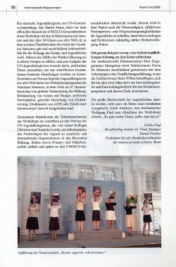 Schüler(innen) machen selber Politik Einen starken Eindruck auf die Schüler(innen) hinterließ auch ein anderer Besucher im Rahmen der Projekttage zum UNESCO-Welt-Jugend-Festival. Der deutsche Jugenddelegierte zur UN-Generalversammlung, Jan Martin Munz, hielt vor dem offiziellen Besuch des UNESCO-Generaldirektors einen Workshop mit den Schüler(inne)n des Instituts und den über 30 Gästen aus aller Welt ab, in dem er einen Überblick über die Arbeit der Vereinten Nationen gab und anschließend leidenschaftlich für die Belange der Kinder und Jugendlichen warb. Nahezu die Hälfte der Weltbevölkerung sei zu dieser Gruppe zu zählen, und eine Aufgabe der UN-Jugenddelegierten bestehe darin, politischen Druck auszuüben, um aus schriftlichen Resolutionen konkrete Handlungen werden zu lassen. Besonders am Herzen liegt den Jugenddelegierten aus aller Welt dabei das Weltaktionsprogramm der Vereinten Nationen, in dem Ziele zu 15 Themenbereichen wie globale Verbesserung der Bildung, Bekämpfung von Armut und Hunger, politische Partizipation, gerechte Gestaltung von Globalisierung, Eindämmen von AIDS oder Erhalt einer lebenswerten Umwelt festgehalten sind. Gemeinsam formulierten die Teilnehmer(innen) des Workshops im Anschluss an den Vortrag des UN-Jugenddelegierten, der von seiner Kollegin Christina Apel begleitet wurde, ein Arbeitspapier, das Forderungen der Jugend an staatliche und internationale Organisationen in den Bereichen Bildung, Kultur sowie Frauen- und Mädchenpolitik enthält und später an den UNESCO-Generaldirektor überreicht wurde. Betont wird in dem Papier auch die Notwendigkeit, effektivere Partizipations- und Mitgestaltungsmöglichkeiten für Jugendliche zu schaffen, damit deren Anliegen und Sichtweisen zukünftig stärker Berücksichtigung finden.