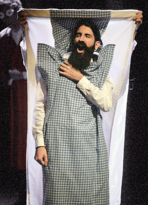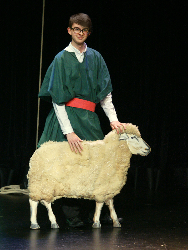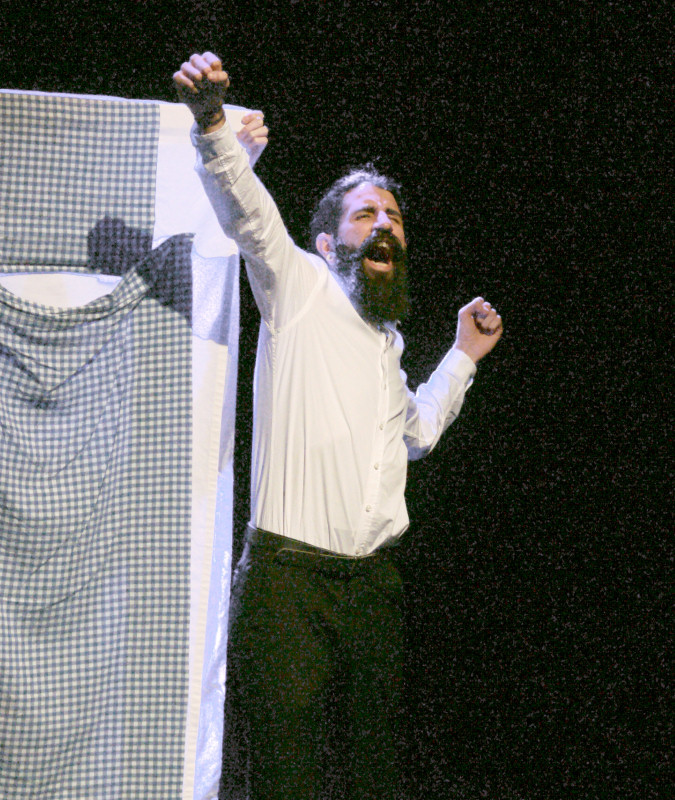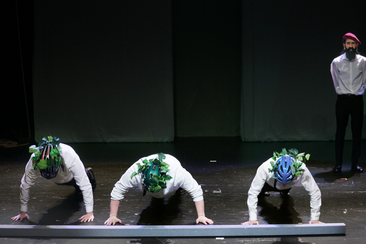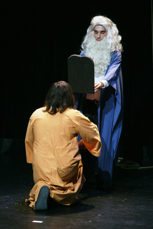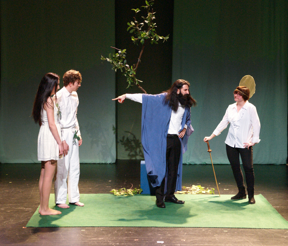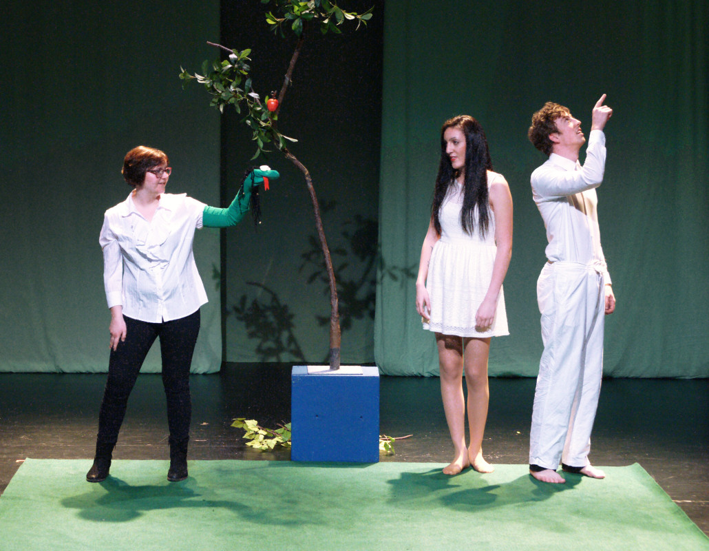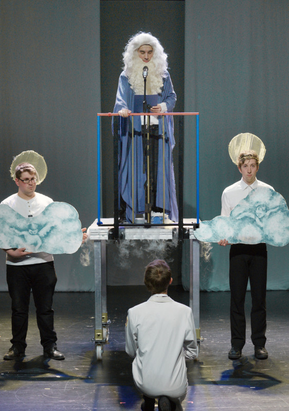 Auf seinem Höhepunkt widmet sich das Stück der Urszene aller Verhaltensfragen: dem Sündenfall, der dem Menschen die Vertreibung aus dem Paradies und damit die freie Entscheidung über sein Verhalten beschert hat. Dabei wird in den Szenen der von Brecht geprägte V-Effekt zur Verfremdung der Wirklichkeit verwendet, was hilft, Dinge aus anderen Blickwinkeln zu zeigen. Tabea Brandenburg beobachtet mit fremdländischem Akzent aus der Distanz "Monsieur Le Gott", wie er die Welt erschafft - köstlich gespielt von Mehran Samadi, der den künstlerisch-kreativen Aspekt des göttlichen (Er-)Schaffens in den Vordergrund stellt. Alles hat seine Folgen, vom göttlichen Wirken bis hin zum kleinsten menschlichen Verhalten. Adam (alias Torben Müller) und Eva (Anna-Lena Kohl) führen vor, dass selbst das Essen eines Apfels globale Auswirkungen nach sich ziehen kann. Und so ist es vor dem Hintergrund von weltweitem Handel und Energiebilanz bis heute geblieben. Als Kain (Kevin Pircher) auch noch Abel erschlägt (Kevin Wegmann), wird "Monsieur Gott" erneut zum Handeln gezwungen: Er händigt Moses (Santiago Alarcon-Ferrer) die 10 Gebote aus.